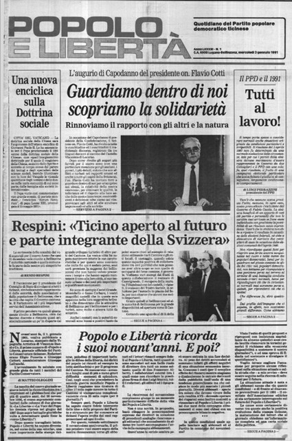 Per la prima pagina ho le idee chiare: gli auguri di Buon Anno di Flavio Cotti, presidente della Confederazione nell’anno del 700.mo, quelli di Renzo Respini presidente del Governo del Cantone Ticino e l’appello di Luigi Pedrazzini, presidente del PPD: «Tutti al lavoro» in vista delle elezioni di aprile.
