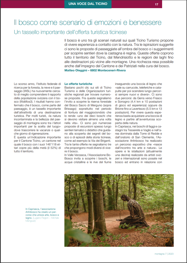 Nella pagina «Una voce dal Ticino» ho raccontato alcuni esempi positivi quali il percorso BoBosco in Valle Verzasca e il percorso espositivo Artinbosco in Capriasca.